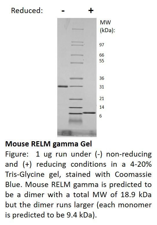Recombinant Protein Mouse Relm-Gamma 100Ug^ Recombinant Protein Mouse Relm-Gamma, Source: Genetically Modified E.Coli, Purity: >/=95%, Predicted Mw: Dimer, 9.4 / 18.9 Kda (89 / 178 Aa), Formulation: Lyophilized From A Sterile (0.2Micron) Filtered Aqueous Solution, Endotoxin: </=1 Eus/Ug, Size: 100Ug
