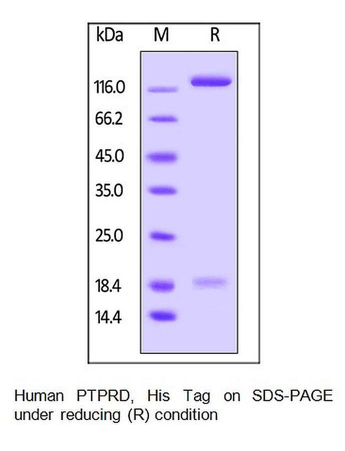 CellExp* PTPRD human recombinant 10 ug^ CellExp* PTPRD, human recombinant, Source: HEK293 cells, Purity: > 90% by SDS-PAGE, Molecular Weight: 140 kDa, synonyms: PTPRD, R-PTP-delta, Endotoxin Level: < 1.0 EU per/ug, Appearance: Lyophilized, Storage: - 20 degree C, size: 10 ug