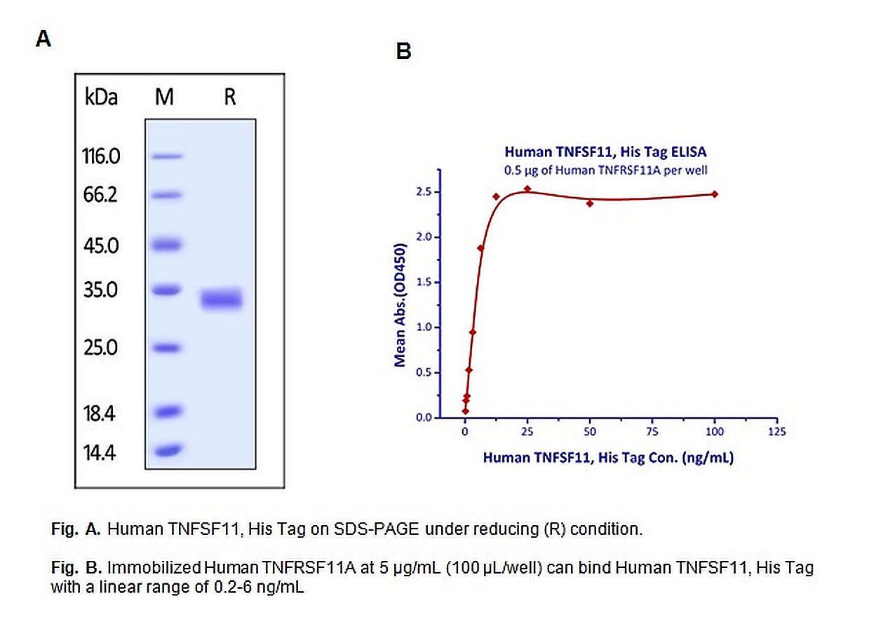 CellExp* TNFSF11 / RANKL / CD254 Human recombinant 50 ug^ CellExp* TNFSF11 / RANKL / CD254, Human recombinant, Source: HEK293 cells, Purity: > 95%, Molecular Weight: 23.1 kDa, synonyms: RANKL, CD254, TRANCE, OPGL, ODF, Endotoxin Level: < 1.0 EU per/ug, Appearance: Lyophilized, size: 50 ug