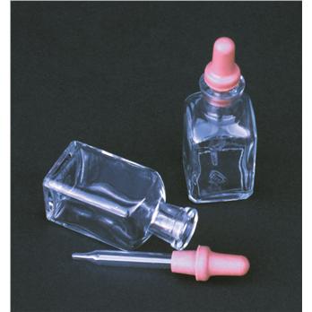Square shaped clear flint glass bottles with glass pipet and rubber bulb stopper. Capacity 30ml. Replacement pipets are also available.