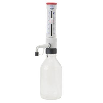 Specifications This new generation of Socorex® Bottle Top Dispensers is intended for the safe and reproducible liquid distribution of volumes up to 25, 50 and 100 mL. The Calibrex™ 525 organo includes a ground glass plunger, best suited for organics, non-crystallizing acid and base solutions. The Calibrex™ 530 solutae has a PFA coated plunger preventing plunger and barrel from seizing together. This enables trouble free distribution of salt solutions, weak and strong acids, as well as bases. The materials in contact with liquid flow are chemically inert, providing for stability and long instrument life.Selection between organo and solutae models for best chemical resistancePermanent fluid path visibilityIntegrated calibration systemChoice of adjustment button with each unitLong lasting performance stabilityAutoclavable at 121°C fully assembledTwo-year warrantySupplied with 45 mm base thread, 120 mm delivery jet and stopper, 350 mm feed tube, alternative screw-type volume setting button, three bottle neck adapters (32, 38 and 40 mm), QC certificate and operating instructions. The dispensers are very easy to disassemble and clean. Dispensers are very easy to calibrate in the lab. The calibration mechanism with integrated key is located under the plunger cap. The instructions are engraved for fast and correct setting. Access to this mechanism is protected by a calibration seal sticker.Calibrex organo and solutae dispensers are also available with a flow control stopcock. This device allows the dispenser to be primed easily without reagent loss or contamination. The reagent is recycled back into the bottle. In addition, the dispensers with the flow control stopcock have a locked position for added safety.Wheaton No.Volume (mL)Accuracy (Absolute Error %)Increments (mL )Reproducibility CV%W8440902.5 - 25<±0.6%0.5<0.1%W8440925-50<±0.6%1.0<0.1%W84409410 - 100<±0.6%1.0<0.1%W8441022.5 - 25<±0.6%0.5<0.1%W8441045-50<±0.6%1.0<0.1%W84401610 - 100<±0.6%1.0<0.1%