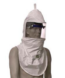 Respirator^ Made from Tyvek QC*, includes an inner bib and accommodates a hard hat for jobs that require head protection, comes complete with hood, breathing tube, and 1/4in industrial intechange fitting.
