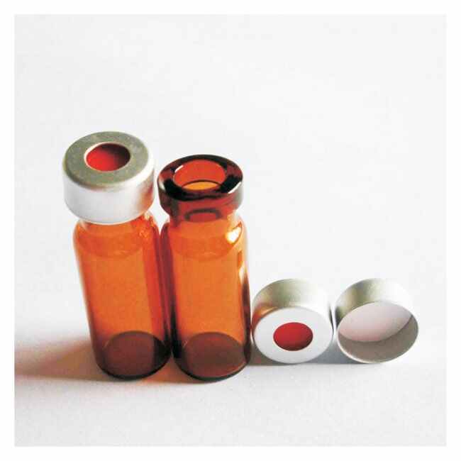 Vials packaged in a clear-lid trayCaps with septa packaged in a plastic bag