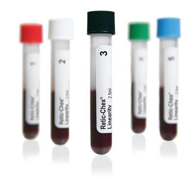 Retic-Chex Linearity^ Designed to establish the patient reportable range and the analytic linearity of the system. Available in four- or five-vial sets with values assigned. Open-vial stability is five days and closed-vial stability is 75 days. For the GenS /LH750 5x1.0mL.