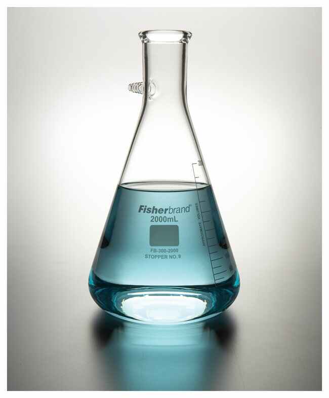 With heavier walls than standard Erlenmeyer flasksSide tubulation Capacity scaleDesigned to take 1 atmosphere of vacuum or 29 in. of mercurySizes 25 through 1000mL have side hose connection designed to accept 5/16 in. O.D. (0.3125) flexible tubingSizes 1000mL and larger accept 3/8 in. O.D. tubingTemperature range: 840°F (450°C) max.