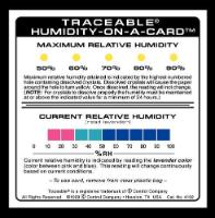 Traceable* Humidity-On-A-Card*^ Humidity card indicates both the current and the maximum humidity attained. Easily monitor humidity levels in shipments, optics, and packaging. Reversible indicator changes color as the humidity increases and decreases. Card size is 10.2x10.2cm. NIST Traceable.