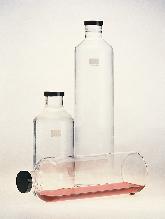 Glass Roller Culture Vessel, Large Neck^ 51-400 cap has shallow skirt and white styrene-butadiene rubber liner. Wheaton-33* low extractable borosilicate glass meets ASTM Type I Class A and USP Type I standards. 1680cm2 culture area. 4230mL. 110diameterx535Lmm. Neck ID: 40mm. Wall thickness: 2.6mm.