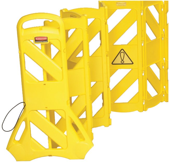 Flexible barrier opens to 13 ft. and can be set straight, curved, or in a circleConsists of 16 articulating panels, two 5 in. nonmarking wheels, and four locking straps to secure barrier in closed positionLightweight with compact footprint of 24 in. × 13 in.For indoor useYellow with ANSI approved graphicsOrder InfoShipped assembled.