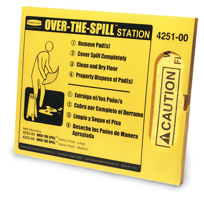 Convenient, highly visible kit keeps absorbent pads at the ready to immediately drop onto spillsRugged dispensing station made of corrugated plasticStation can be mounted on any flat surface and dispenses medium or large pads (pad refills sold separately)Pads constructed of meltblown polypropylene for added strength and absorbency Each yellow absorbent pad serves as a caution sign—universal caution symbol and “Caution Wet Floor” message is printed on each pad in English and SpanishOver-the-Spill Pad Tablet includes same printed multilingual messages as pad refills; tablet backing is constructed of corrugated plastic and mounts on flat surface or affixes directly to floor sign† When station is filled with large pads.