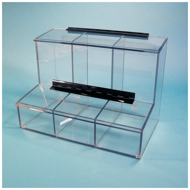 Dispensers feature three compartments with access trays and lid. Flame-treated edges ensure a smooth finish, with rubber footing to prevent scratching.