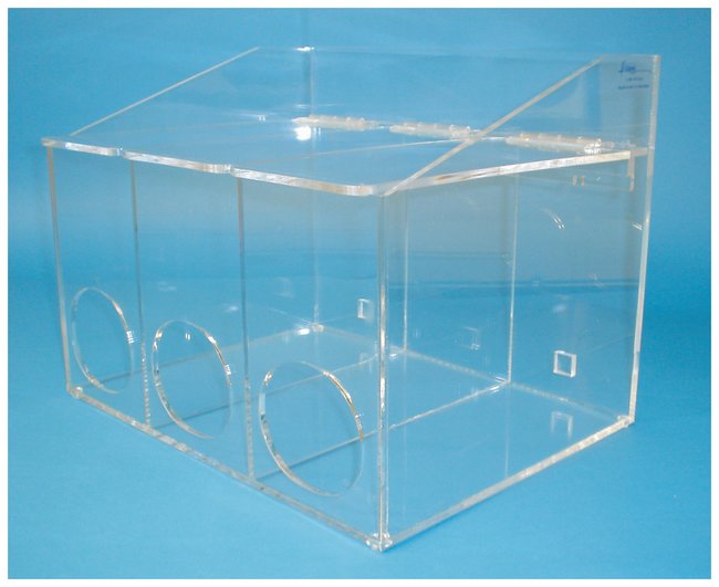 Three compartment dispenser includes three individually opening lids, with front access holes for easy product dispensing.