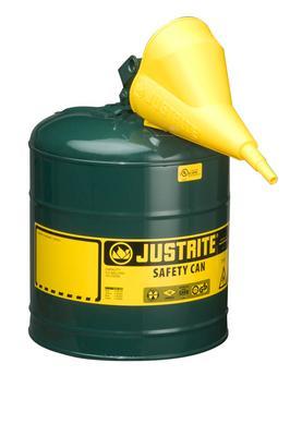 SAFE CAN GRN W/FUNL 5G/19L^ Self-closing lid, leak proof, w/large ID zone for user labeling. Has a rounded comfort handle, reinforcing ribs and a large 1/2IN grip lip along bottom. 100% leak tested. 10 year warranty. Meets OSHA and NFPA. FM, UL, ULC Listed. CARB Compliant. TUV certified
