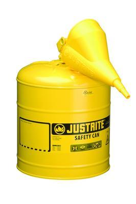 SAFE CAN YEL W/FUNL 5G/19L^ Self-closing lid, leak proof, w/large ID zone for user labeling. Has a rounded comfort handle, reinforcing ribs and a large 1/2IN grip lip along bottom. 100% leak tested. 10 year warranty. Meets OSHA and NFPA. FM, UL, ULC Listed. CARB Compliant. TUV certified