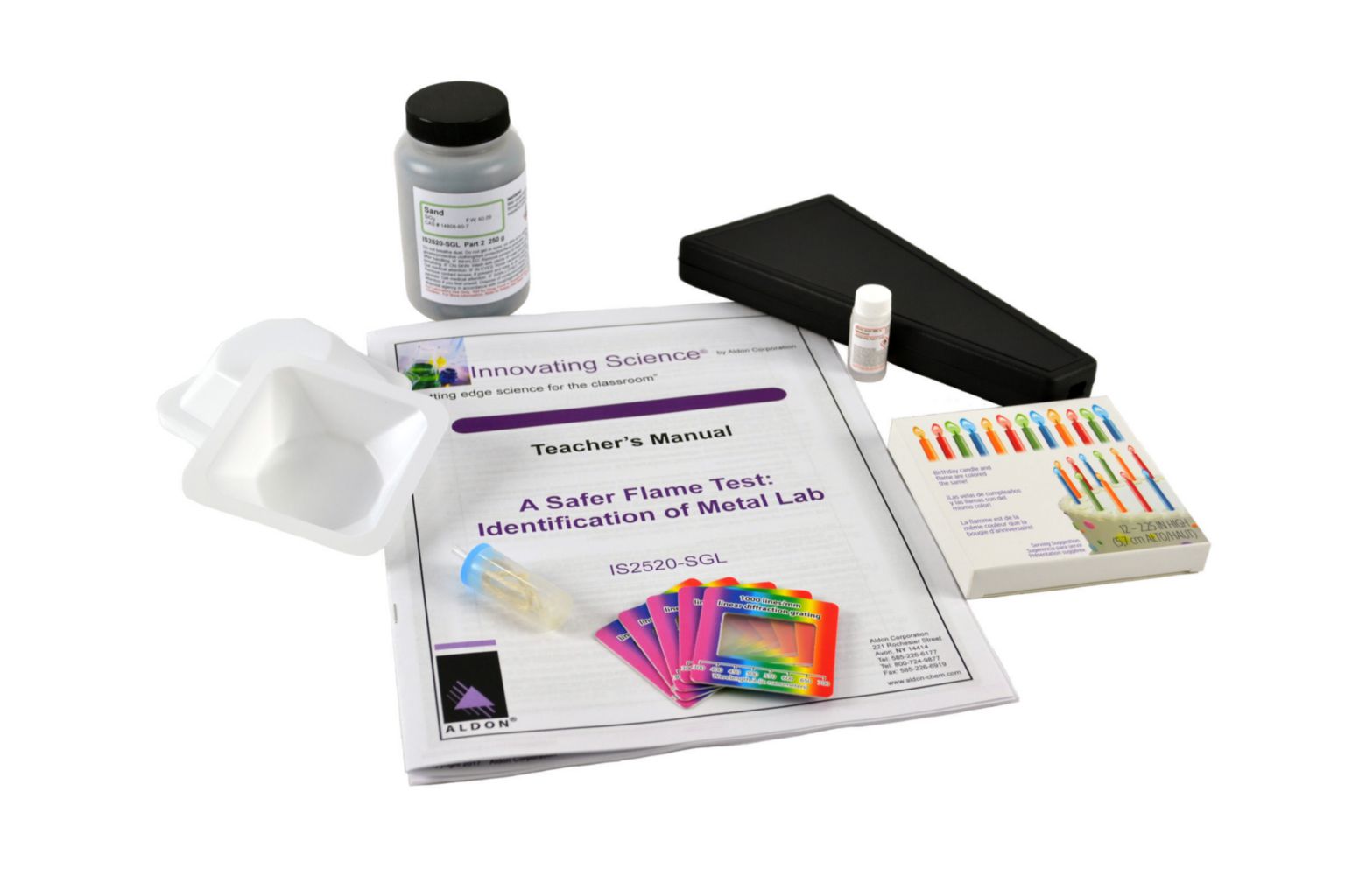 Safer Flame Test Kit^ Safer Flame Test Kit, Identification Of Metal Lab, Includes: Boric Acid 10% In Methanol, Sand, Color Flame Candles, Alcohol Burner, Diffraction Slides, Spectroscope, Small Trays, Analytical Technique Used For The Identification Of Certain Elements, Primarily Metal Io