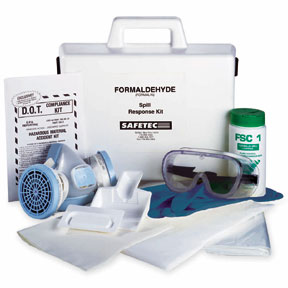 Emergency response kit for containing small spills in the lab immobilizes formalin and minimizes off-gassing.Features FSC-1 to aid in reducing exposure to formaldehyde gas in the event of a spill. The formalin is transformed into an easily removable semi-solid mass and the resulting mass cools rapidly, minimizing formaldehyde off gassing.