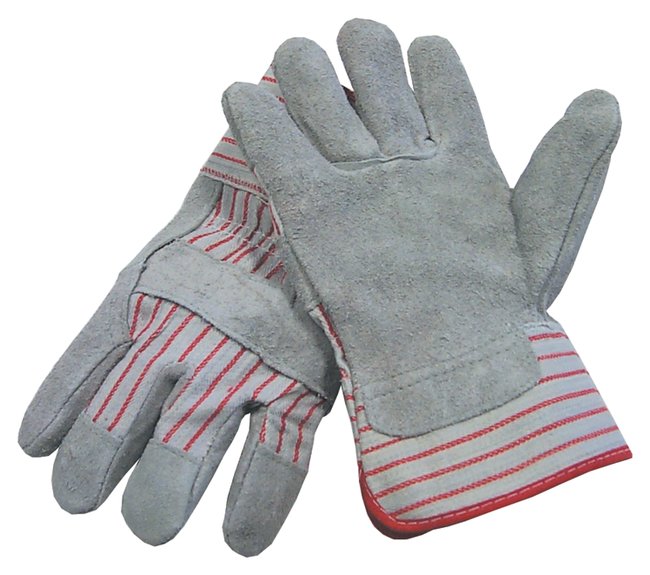 Split-cowhide leather gloves with a traditional striped-fabric back and safety cuff.