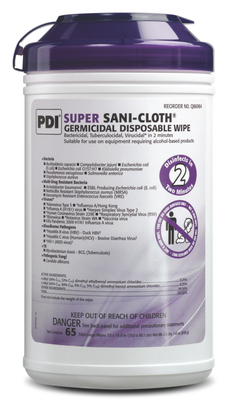 PDI* Super Sani-Cloth* Germicidal Disposable Wipes^ With 55% alcohol for faster kill times. Effective against broad range of gram positive and gram negative bacteria including MRSA and VRE. Kills TB in 1 minute. EPA registered. Meet CDC, OSHA guidelines. Packed 65 wipes/canister. Size: 20.3x35.5cm.