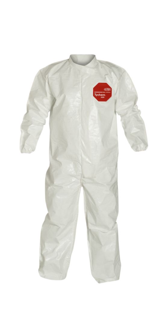 DuPont* Tychem* SL Coverall^ Made of Saranex* 23-P film laminated to Tyvek* fabric. Provides effective protection against a range of chemicals. Abrasion-resistant coverall features bound seams, elastic wrists and ankles, storm flap, and front zipper closure. White. Size: 4X-Large.