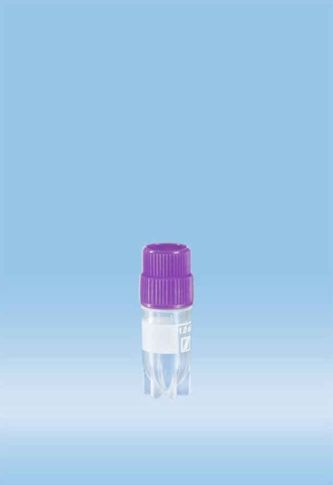 Tube, Cyrogenic; CyroPure; Sarstedt; Vol.: 1.0mL; With external thread; Sterile; Violet cap; Interlocking base enables single-handed operation in CryoRack 40 and most cryogenic racks; Fit standard cryo boxes and aluminium holders; 500/pk.