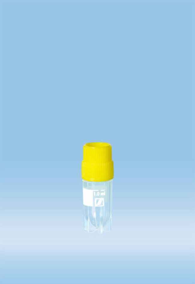 Tube, Cyrogenic; CyroPure; Sarstedt; Vol.: 1.0mL; With external thread; Sterile; Yellow cap; Interlocking base enables single-handed operation in CryoRack 40 and most cryogenic racks; Fit standard cryo boxes and aluminium holders; 500/pk.