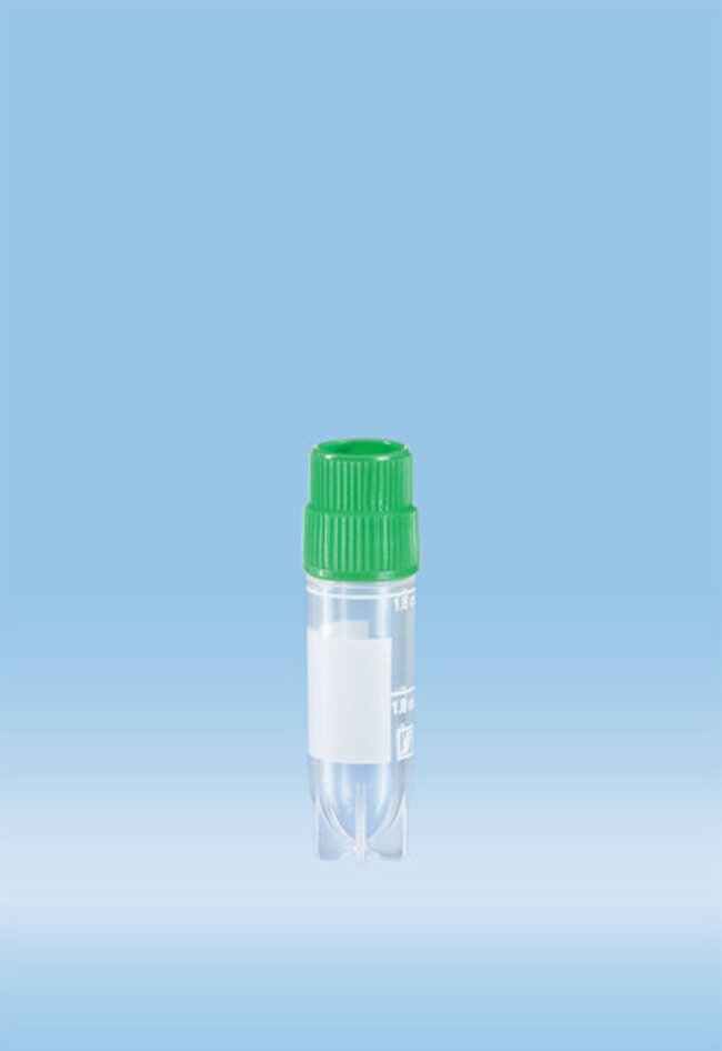 Tube, Cyrogenic; CyroPure; Sarstedt; Vol.: 1.8mL; With external thread; Sterile; Green cap; Interlocking base enables single-handed operation in CryoRack 40 and most cryogenic racks; Fit standard cryo boxes and aluminium holders; 500/pk.