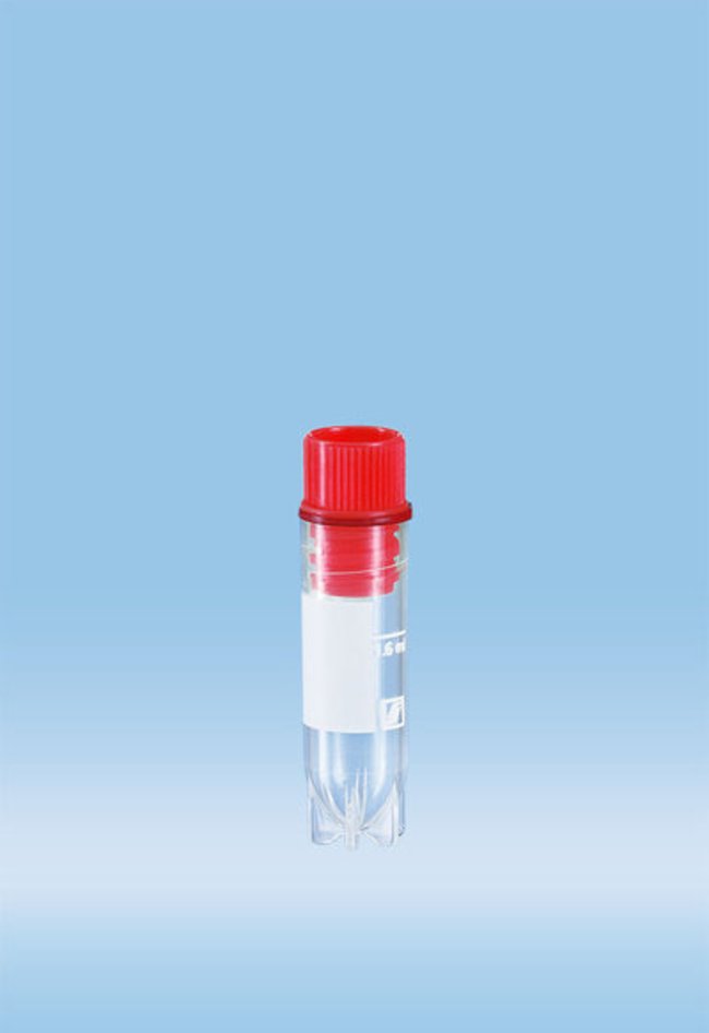 Tube, Cyrogenic; CyroPure; Sarstedt; Vol.: 1.6mL; With internal thread; Sterile; Red cap; Interlocking base enables single-handed operation in CryoRack 40 and most cryogenic racks; Fit standard cryo boxes and aluminium holders; 500/pk.
