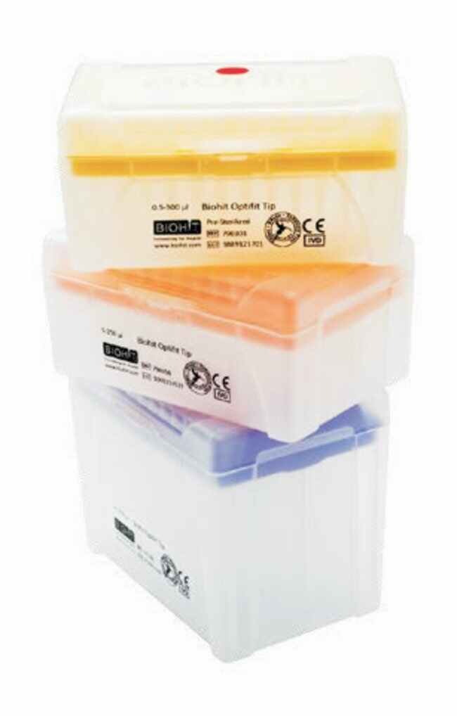Perfect tip fitting and sealing to the pipetter results in the best possible accuracy and precision. Compatible with Optiload feature in Picus, eLINE™, mLINE™ and Proline™ Plus pipetters, enabling ergonomic and light tip attachment and ejection.Precision made tipsProvide best possible accuracy and precision Compatible with most other pipetter makes ISO 8 Clean Room manufacturing process Made from highest quality virgin polypropyleneDNase, RNase and endotoxin-free certifiedAvailable as e-beam presterilized or nonsterilizedInformative rack labeling improves tip identification and traceability: volume, product number, lot numberRacks, trays and tips are 100% recyclableAir-tight plastic wrapping around the rack secures purity during transport and storage (plastic wrapping is regular waste)Tip trays are color-coded to indicate the matching, color-coded pipetterFully autoclavable at 121°C for 20 minutesCertificationsCE certified. Manufactured according to ISO 9001 and ISO 13485.