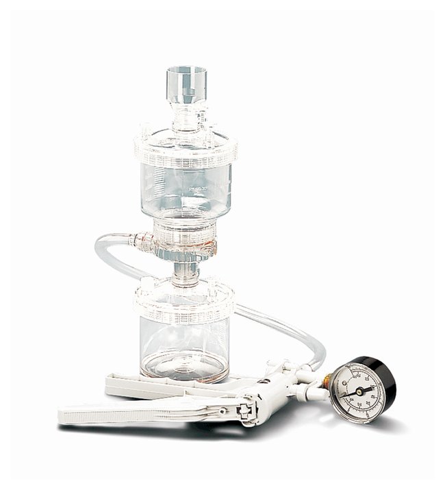 For the clarification or sterile filtration of up to about 200ml volumes of aqueous solutionsType 16510 is complete with receiver flask, and can be operated with sub-pressure as well as with slight over-pressure (0.5 bar is recommended for highest standing times). It is, together with a vacuum hand pump, a practical, cost-effective system for the filtration in the laboratory or outside.For sterile filtrations, the filter holder, comprised in the delivery, is equipped with a glass fibre filter 13400-0013 and enables a sterile venting for pressure compensation in order to avoid contamination of the sterile filtrate. The funnel fits onto the central opening of the lid and simplifies the pouringin of liquid in the top part. Type 16511 is like 16510, but without receiver flask. It is used on a suction flask or a vacuum manifold, e.g. Combisart.