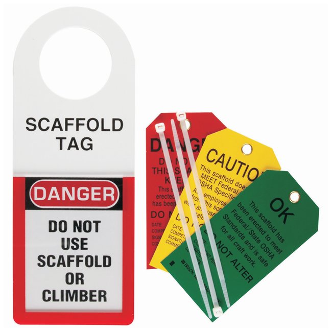 Brady's scaffold kit contains holder and three scaffolding tags (DANGER, CAUTION, AND OK).Holder accommodates tags with a size of 5 3/4 in. x 3 in.