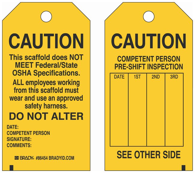 Identify facility equipment to your exact specifications. Brady™ Scaffolding Tags are durable two-sided tags with a write-on area that accepts most marking pens.