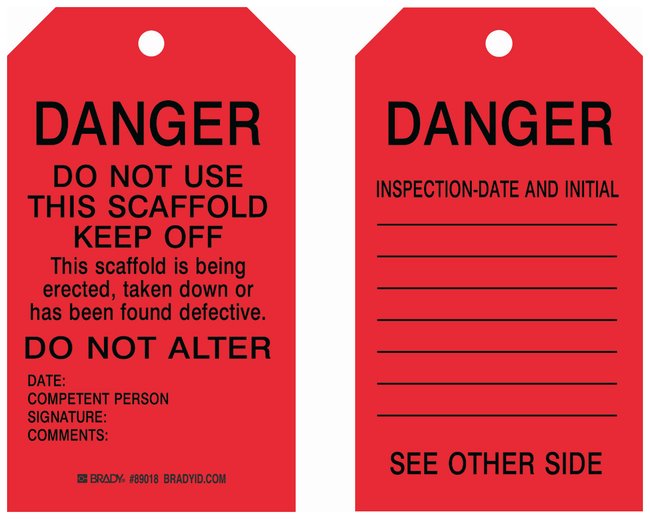 Identify facility equipment to your exact specifications. Brady™ Scaffolding Tags are durable two-sided tags with a write-on area that accepts most marking pens.