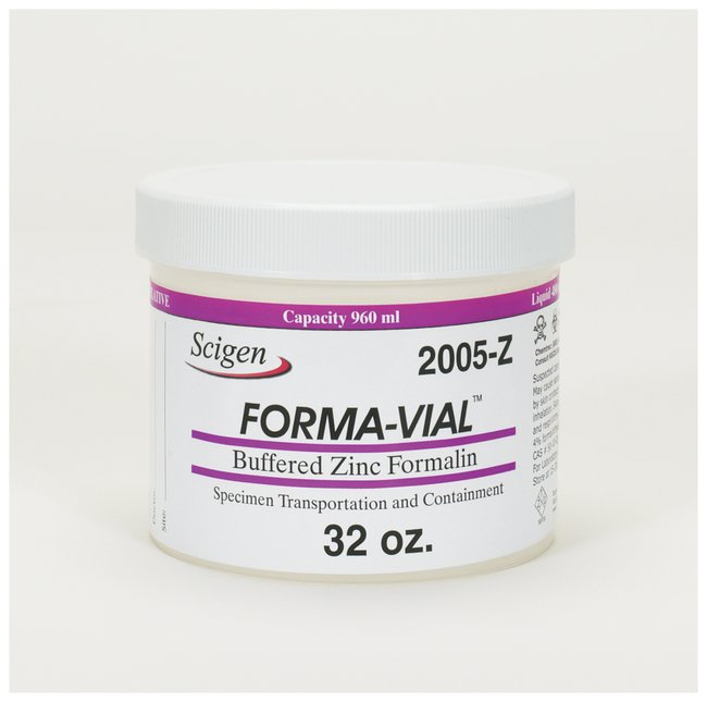 Safely transport, store and retrieve pathology specimens using Scigen's Forma-Vial™ system. Containers from 30 mL to 7.5 Liters, filled with buffered zinc formalin, OSHA compliant.