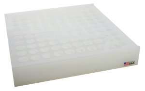 Welded polypropylene rack holds the included 100 standard 20 mL scintillation vials (202244). Rack is autoclavable and resists both nitric and hydrochloric acids. Hole diameter: 1 1/16”