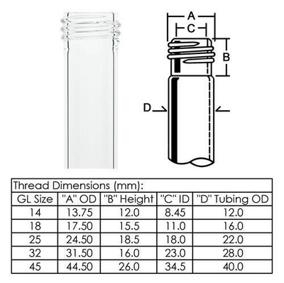 SCREW THREAD TUBE, GL^ Tubing Dimensions O.D.xWall: 28x2.0mm. OAL: 100. Thread Size: 32. O.D: 31.50. Height: 16.0. I.D: 23.0. Tubing: 28.0. Screw thread tube for replacement on apparatus using the GL thread which is manufactured to I.S.O. specifications. (GL is the I.S.O.