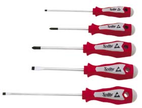 Xcelite* Pro-Series Five-Piece Screwdriver Set^ Chrome Molybdenum Vanadium Steel Shafts With Black-Oxide Tips. Rubber-Coated Dual-Material Ergonomic Handles. Esd-Safe. With Hanging Display Box. Includes Phillips* No. 1 And No. 2 And Drivers For Slotted Screws With Diameters Of 1/8", 3/16", And 1/4".