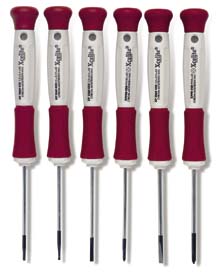 Xcelite* Precision Electronic Screwdriver Set^ ESD-safe. Chrome-molybdenum-vanadium steel blades. Fast turning swivel caps with cavity, black oxide tips, no-roll handle design, storage case. Includes #0 point and #00 point Phillips* and 1.5mm, 2.0mm, 2.5mm, and 3.0mm slotted tip screwdrivers.