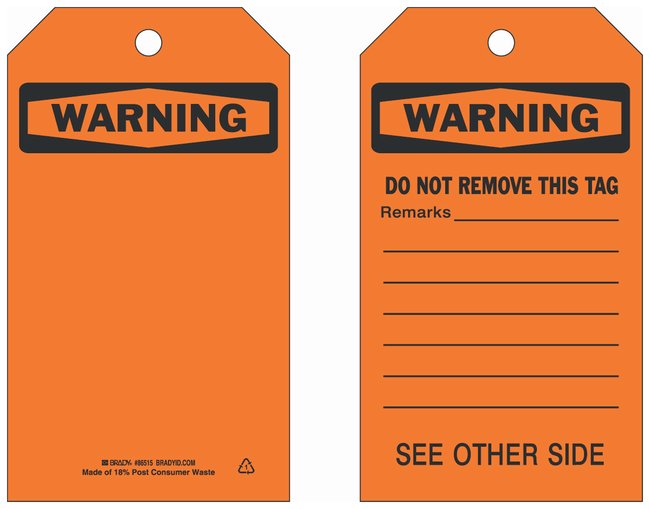 Identify facility equipment to your exact specifications. Brady™ Polyester Tags WARNING are durable two-sided tags with a write-on area that accepts most marking pens.