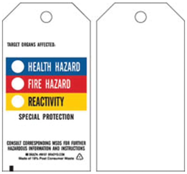 Self-Laminating, Two-Sided Polyester Tag: TARGET ORGANS AFFECTED HEALTH HAZARD: FIRE HAZARD: REACTIVITY…, Pack of 25