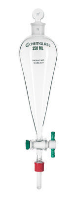 Funnel with 24/40 Stopper, 1L capacity, Stopcock size 4^ Squibb style separatory funnel with a fluoropolymer resin stopcock. Includes glass stopper. Made entirely of TFE, the stem attaches directly to the stopcock without o-rings or other gaskets