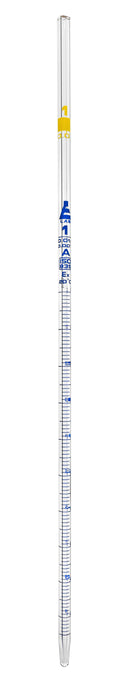Serological pipette made of high quality, heavy duty Borosilicate 3.3 glass. 1.0ml capacity, 0.01ml blue graduation lines, marked every 0.1ml. Class A, tolerance, ±0.007ml. Calibrated for delivery to jet. Pipette measures 14.25" in length, and has a body diameter of 0.25". Top has an inner diameter of 2.5mm and an outer diameter of 7mm. Autoclavable, with superior chemical durability. Low temperature gradient- can withstand high temperatures & thermal shocks. Eisco Labs Borosilicate glass has the following heat tolerances: Strain Point -515°C | Annealing Point 565°C | Softening Point 820°C.