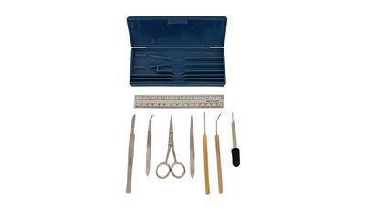 Dissecting Set^ Eight piece kit contains: 152mm steel scalpel medium fine straight and medium curved 117mm forceps straight and bent wooden handle needles dropper pipet scissors and ruler. Enclosed in leatherette case.