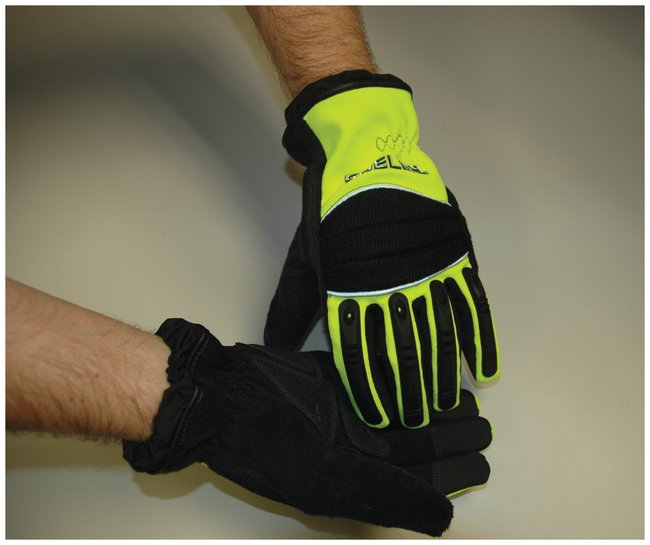 Glove body is constructed of durable Nylon Cordura™Palm and finger reinforcements cover all high-wear stress points with Aramid Fiber fabricRubberized fingers enhance grip in wet or slippery situationsBlack with chartreuse glove back for improved visibilityShirred elastic wrist closure