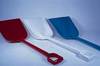 One-Piece Sanitary Shovel, Polypropylene^ Blue, square point polypropylene shovel has a deep bucket capacity and a 43x38cm blade. One-piece construction eliminates weak points and loose handles. Chemical and corrosion resistant. Shaft diameter is 3.8cm. Overall length is 101cm.