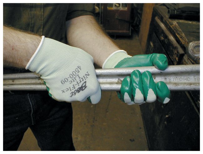 Flat dipped nitrile-coated gloves provide abrasion resistance and enhanced grip capabilities in dry conditions.