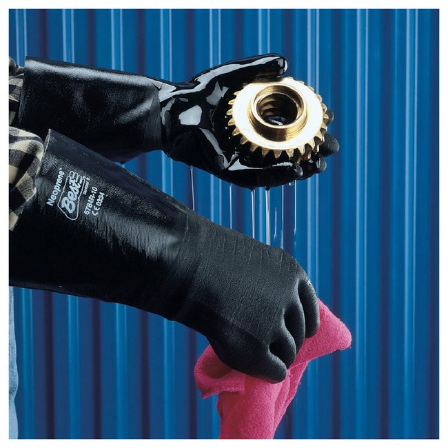 Chemical resistant neoprene glove with soft cotton liner features a rough coating to protect against acids, chemicals and caustics.