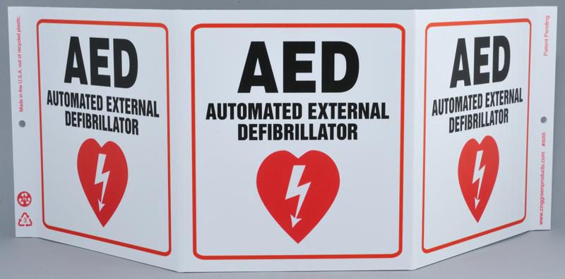 Sign Aed Automated Extern Aluminium Plastic 75X20In^ Safety Sign, Recycled Plastic, Aed, Triview 3 Sided Projecting Provides Greater Visibility, Pre-Drilled Mounting Holes & Adhesive Tabs, Impact And Uv Resistant, Ul Validated For Recycled Content, 7.5X20I