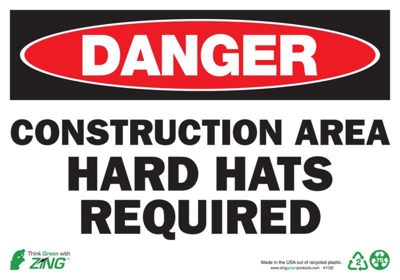 Sign Danger Construction Area Plastic 10X14In^ Danger Sign, Recycled Plastic, Construction Area Hard Hats Required, Pre-Drilled Mounting Holes & Adhesive Tabs, Impact And Uv Resistant, Ul Validated For Recycled Content, 10X14I