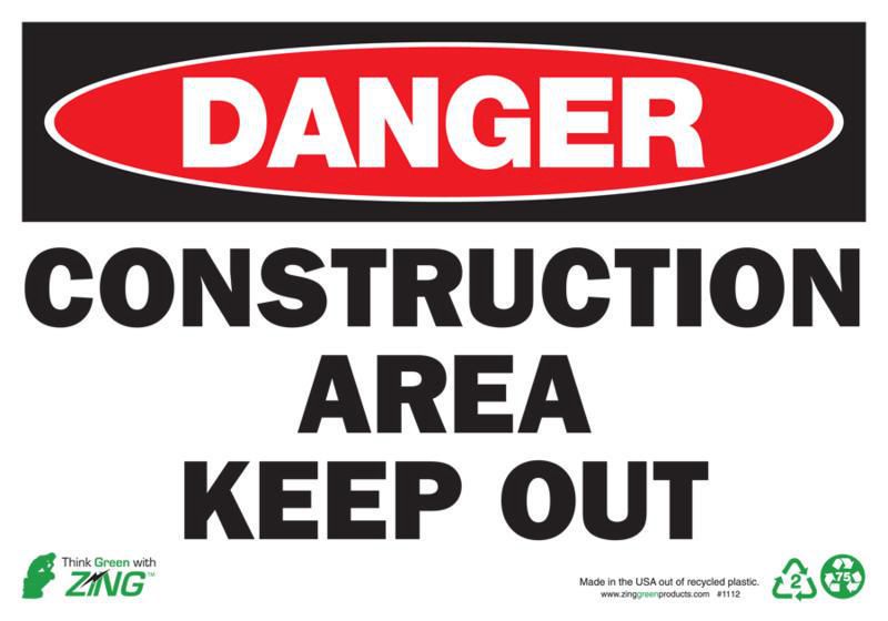Sign Danger Construction Area Plastic 10X14In^ Danger Sign, Recycled Plastic, Construction Area Keep Out, Pre-Drilled Mounting Holes & Adhesive Tabs, Impact And Uv Resistant, Ul Validated For Recycled Content, 10X14I