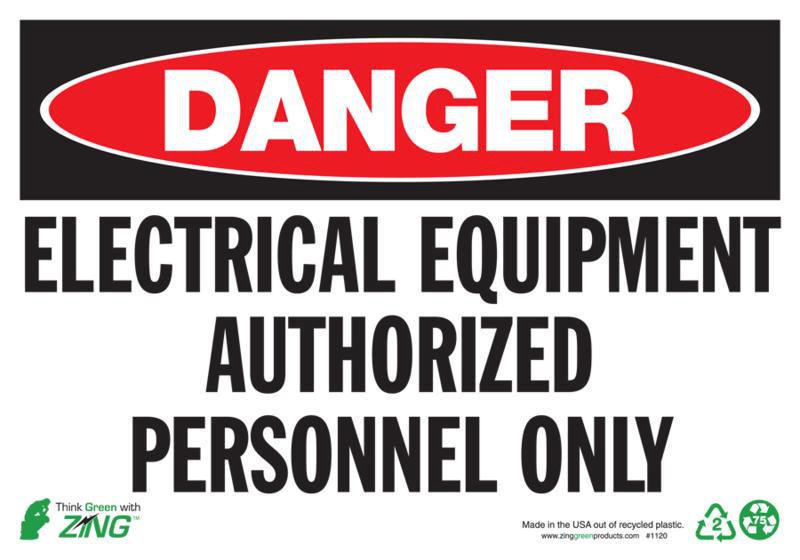 Sign Danger Electric Aluminium Eq Plastic 10X14In^ Danger Sign, Recycled Plastic, Electrical Equipment Authorized Personnel Only, Pre-Drilled Mounting Holes & Adhesive Tabs, Impact And Uv Resistant, Ul Validated For Recycled Content, 10X14I