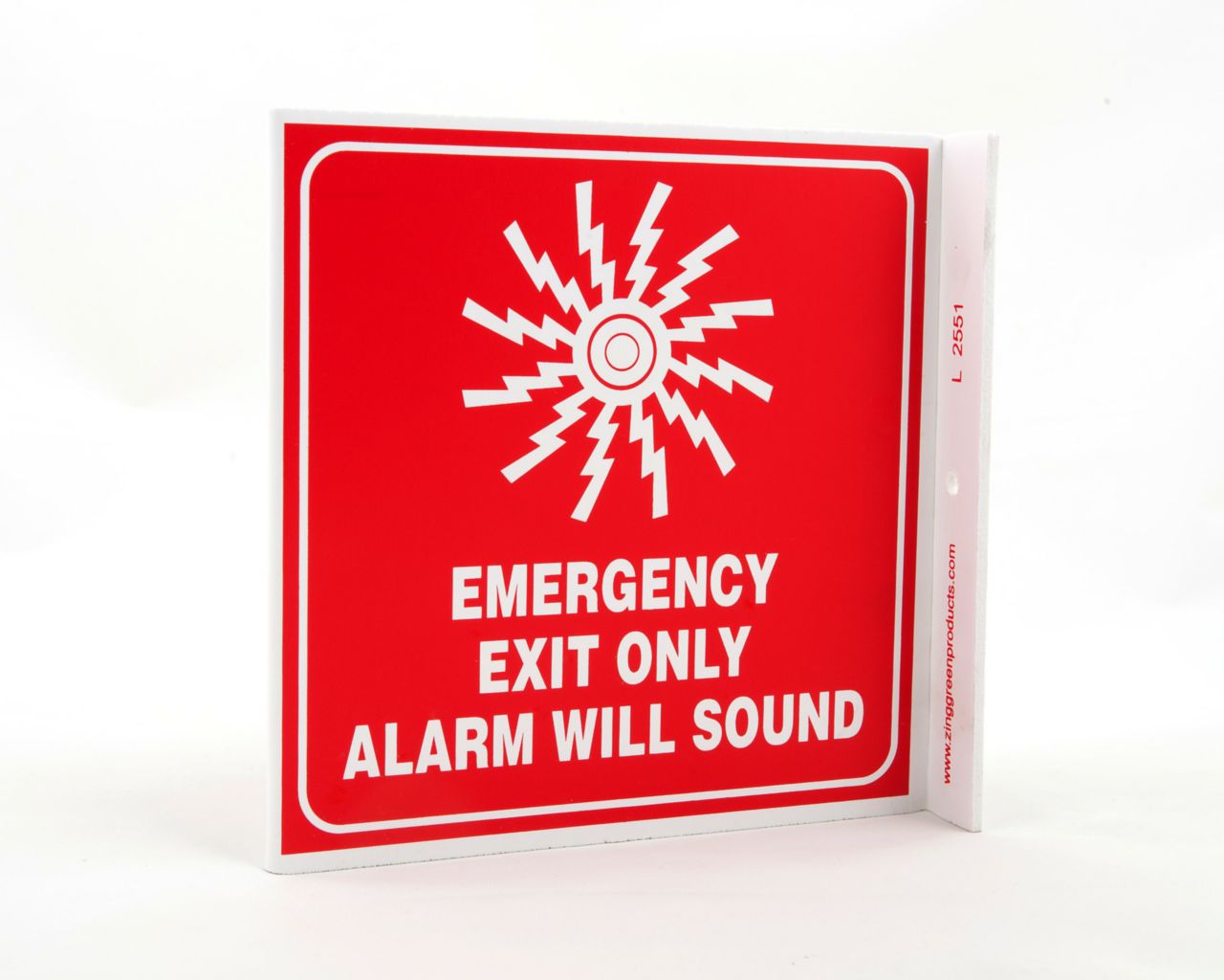 Sign Emergency Exit Only Plastic 7X7In^ Exit Sign, Recycled Plastic, Emergency Exit Only, 2 Sided L Shaped Projecting Provides Greater Visibility, Pre-Drilled Mounting Holes & Adhesive Tabs, Impact And Uv Resistant, Ul Validated For Recycled Content, 7X7I